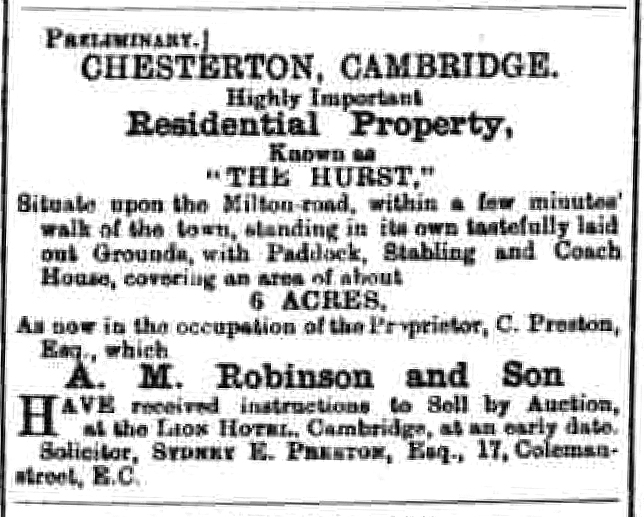 In the 1891 census the occupiers of Hurst were: Taylor; Mary Taylor, wife; Elizabeth Ann, daughter; Mary Ann Ground Taylor, daughter; Joshua Taylor, son; Sarah Ann Papworth, Housemaid; and Fanny Ashman, cook. Kelly’s Directory of 1892 shows Preston at Spring Cottage in Chesterton Road.