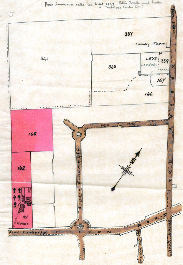 This 1885 plan gives a good idea of the layout of the house, gardens, outbuildings and farmland at Hurst. Hurst Park Avenue was cut straight from Milton Road in 1928 on a line that took it through the vinery and farmery and bent slightly right across the corner of the windmill plot. It then heads straight again up the middle of the kitchen garden / arable area and on into Besters Farm (Cambridge University Library).