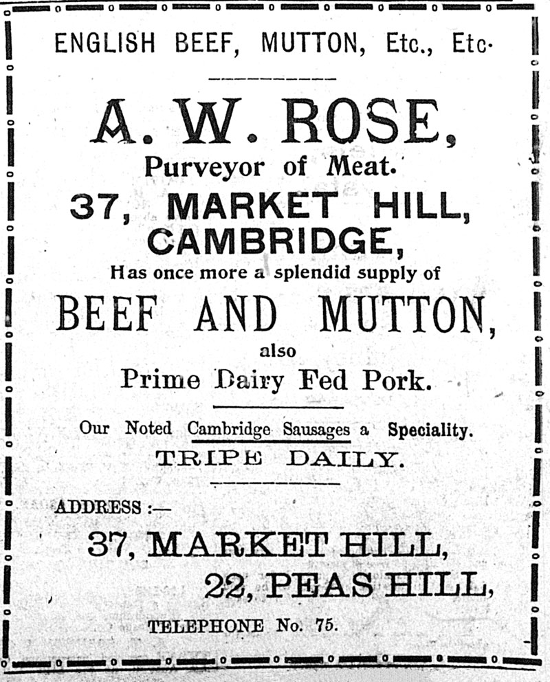 Arthur Rose established his slaughterhouse next to the mill. This advertisement is from the Cambridge Chronicle of December 12, 1913. He died in November the following year, leaving the business to wife Etheldra and son Stanley.
