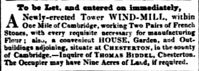Inevitably in a sale document, there was an optimistic view of business prospects that was perhaps belied by Mann’s situation: “It presents a rare opportunity for any Person desirous of entering the Milling Business, on account of its proximity to the important University Town of Cambridge, and there being but little competition in the Neighbourhood”. The auction was to be at the Bird Bolt Inn. That the mill is referred to as ‘The Union Windmill’ probably refers to its being owned, in effect, by a group of Mann’s creditors. Other Union mills were owned by consortia or sometimes by creditors.